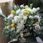 ランキュラスやマトリカリア、千日紅にミントやローズマリーなどのハーブを合わせました。